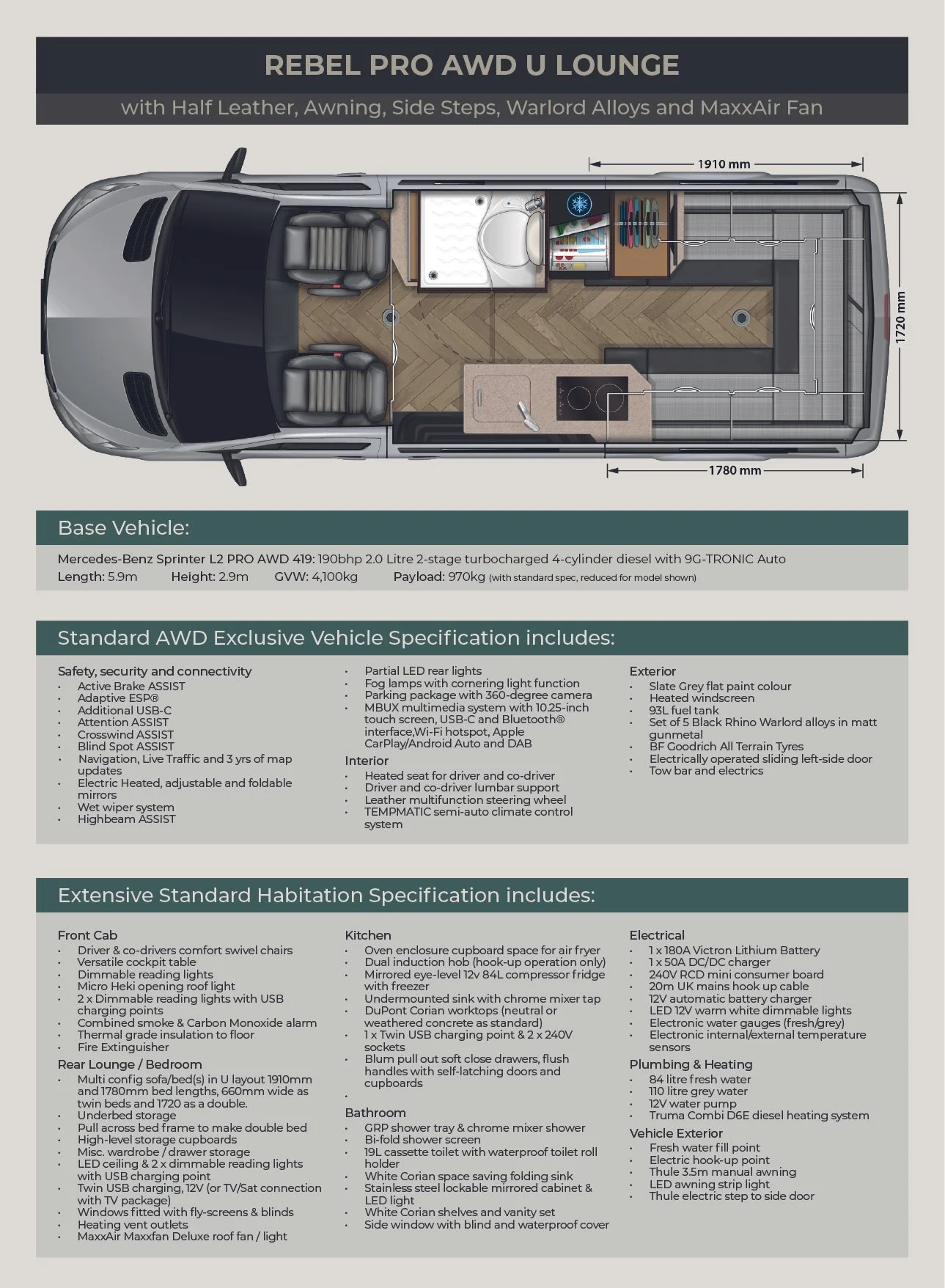 The Rebel AWD combines impressive performance with a highly specified interior, backed by a three-year Mercedes warranty and a two-year RP habitation warranty.